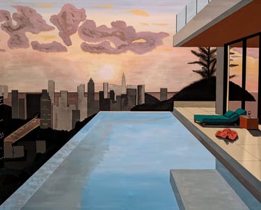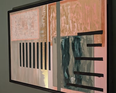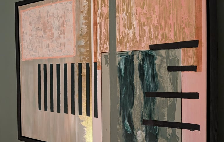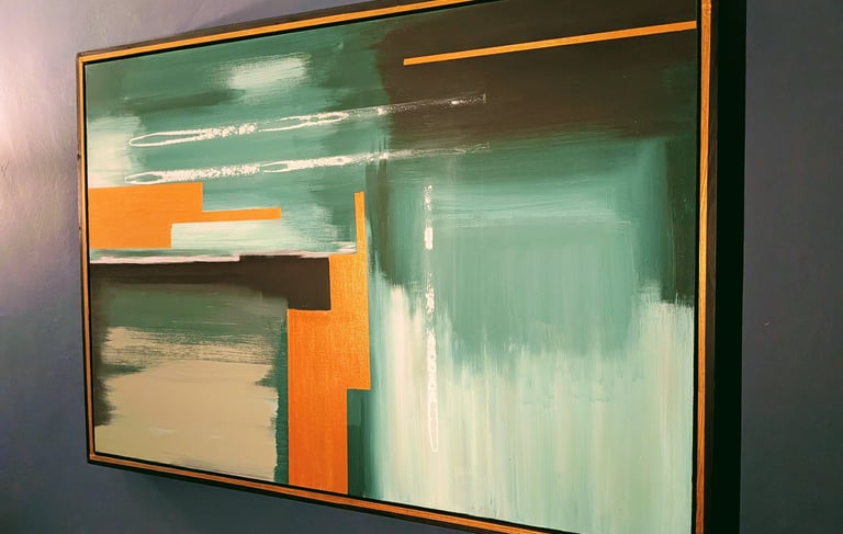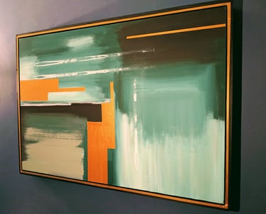 Acrylic and emulsion on canvas (xcm x xcm) - with a large wall in the lounge to fill. I wanted something big, and punchy. Making use of other left over wall paints, the green contrasting the dark blue with a deep mood.